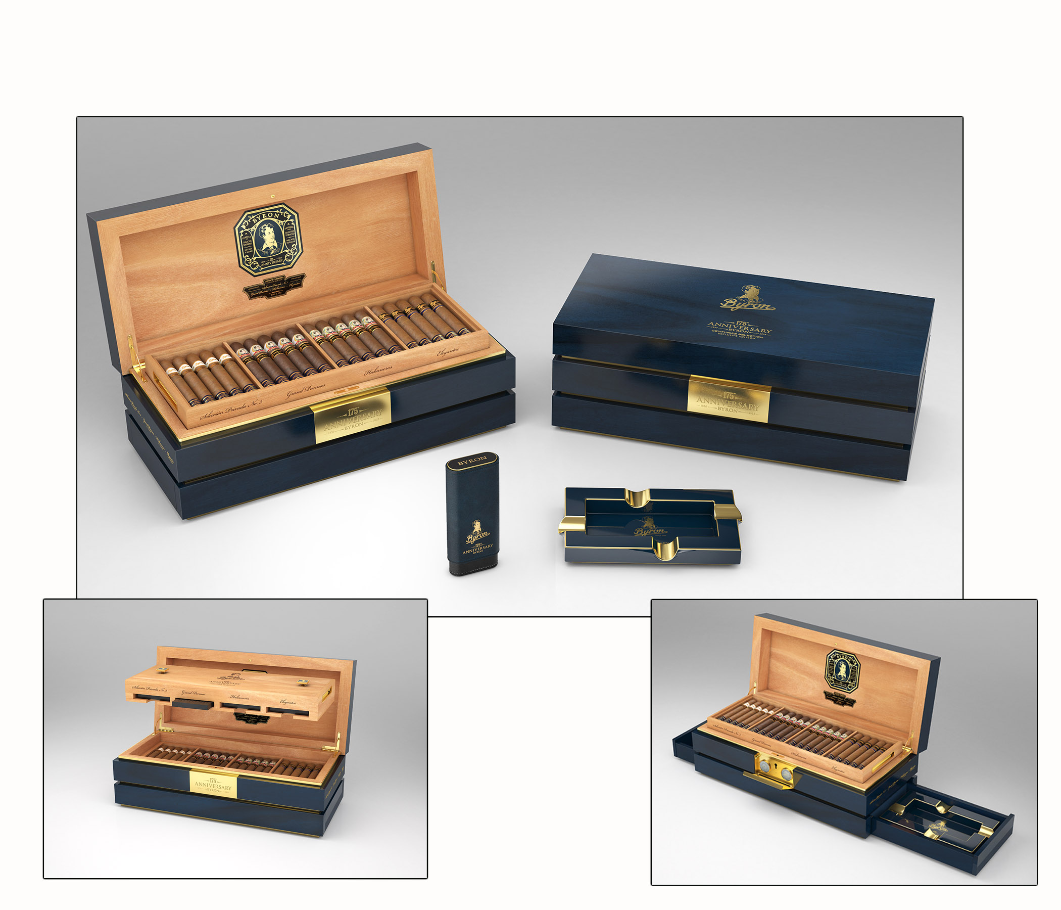 Only 175 Humidors are being released with 150 of those in the U.S. market. Humidor features two sleek side drawers designed to house exclusive Byron accessories, a luxurious three-finger cigar case and matching ultramarine ashtray, an elegantly appointed top shelf holding 20 cigars with concealed humidification chambers beneath, and a gold-accented front panel that discreetly conceals a hygrometer, temperature gauge, and locking mechanism. All cigars have a 175th commemorative foot band.